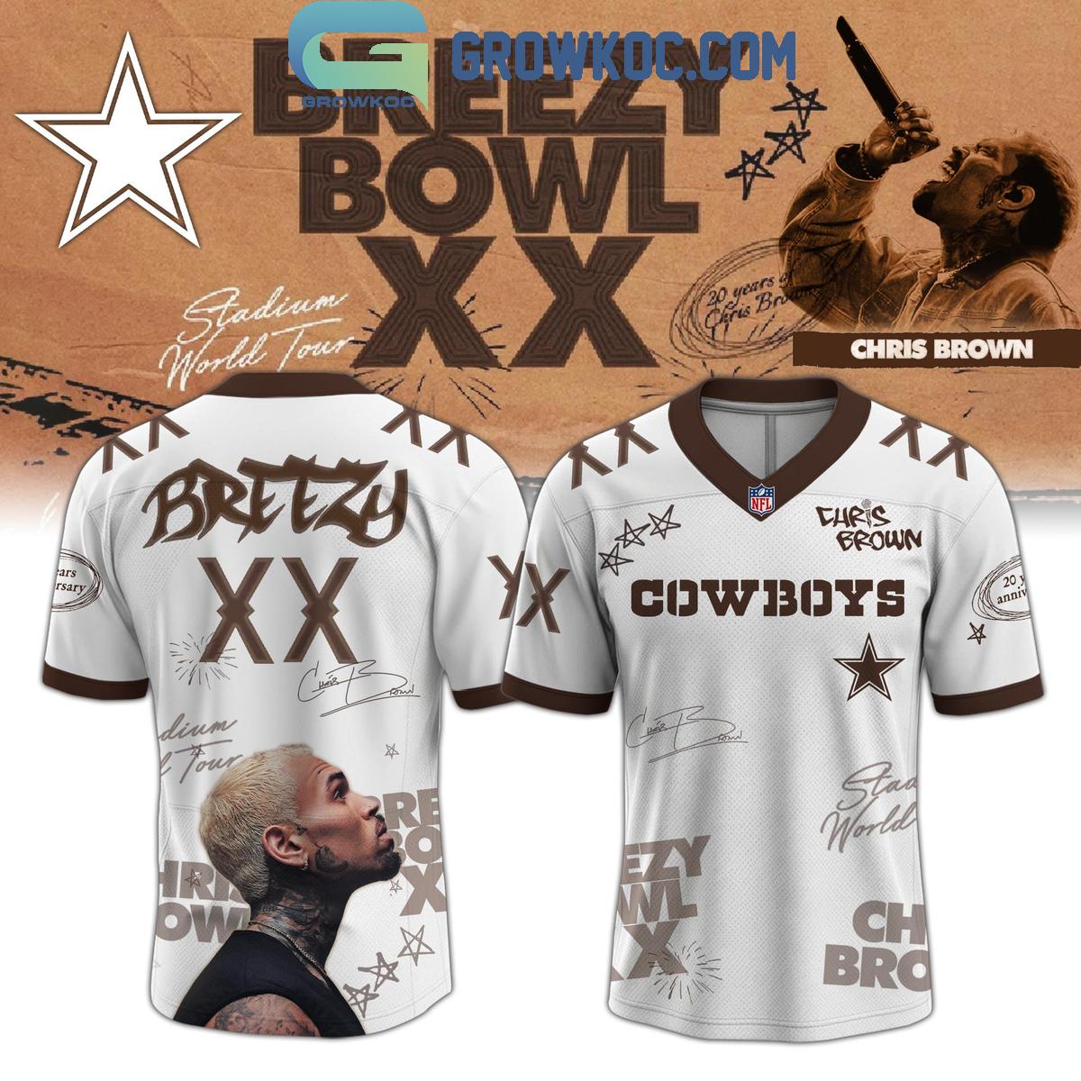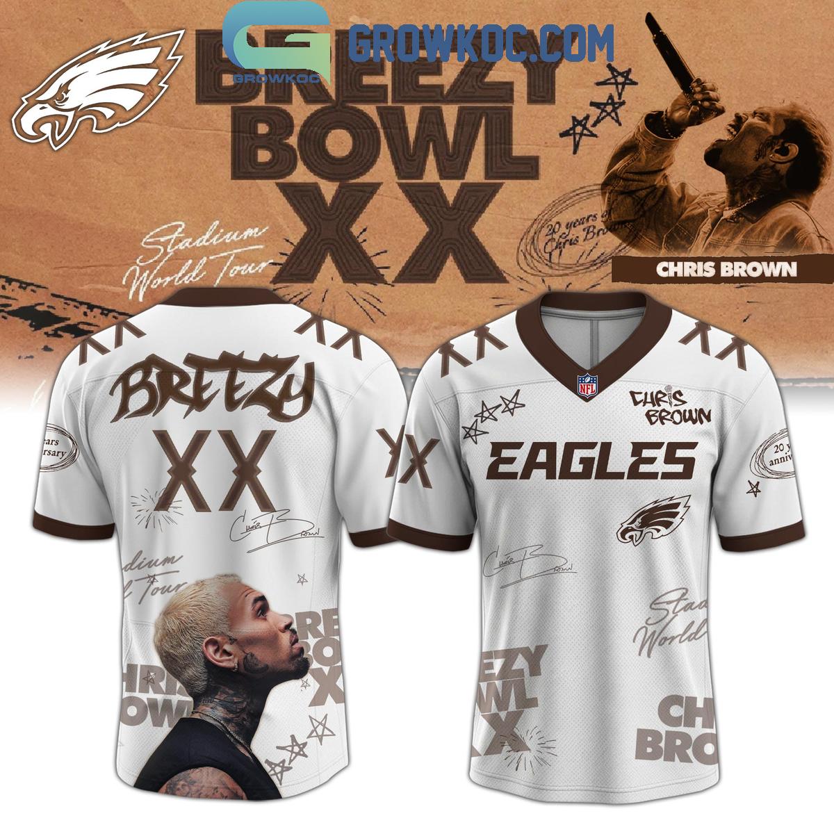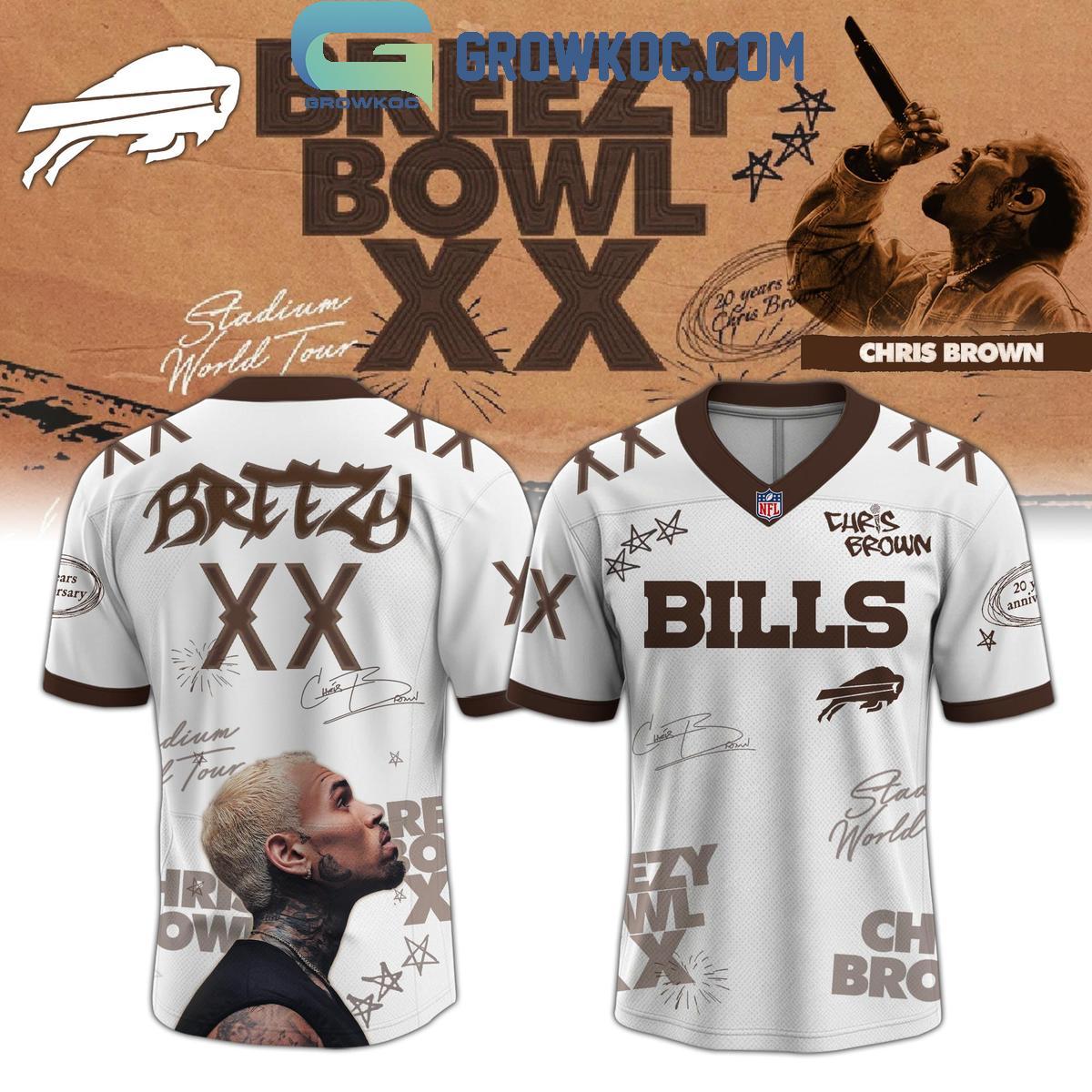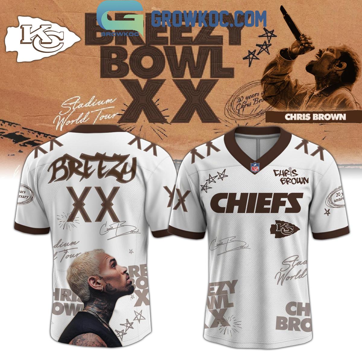 Celebrate the ultimate fusion of music and football with the NFL All Teams x Chris Brown Breezy Bowl XX World Tour 2025 Football Jersey. This exclusive collector’s jersey honors 20 years of Chris Brown’s legendary career, combined with the excitement of NFL team spirit. Featuring a crisp white and brown design, the front proudly displays official NFL team names and logos like the Eagles, Bills, Cowboys, and Chiefs, alongside Chris Brown’s autograph-style graphics and “Stadium World Tour” details.