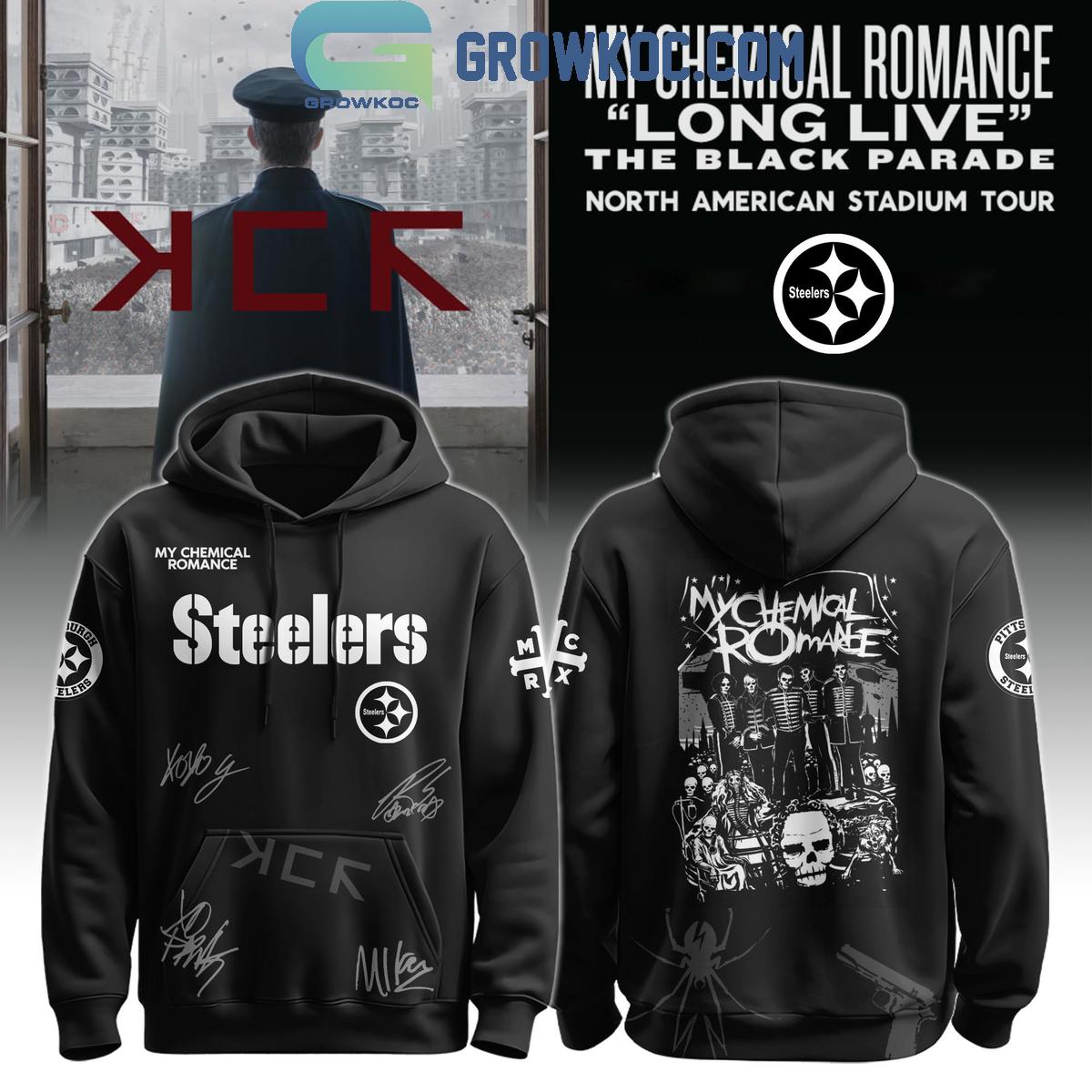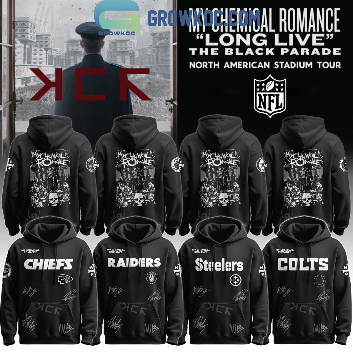Celebrate the ultimate fusion of rock music and football with the NFL All Teams x My Chemical Romance “Long Live The Black Parade” Tour 2025 Hoodie Shirt. This exclusive black hoodie pays tribute to the legendary The Black Parade era as My Chemical Romance embarks on their 2025 North American Stadium Tour, while featuring iconic NFL team logos like the Chiefs, Raiders, Steelers, and Colts.