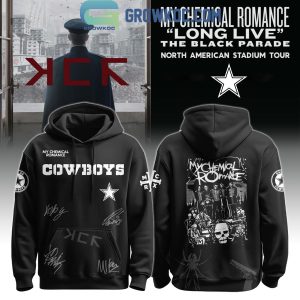 The front of the hoodie showcases bold NFL team branding alongside My Chemical Romance graphics, including the band’s signature logo and tour-inspired details. On the back, a striking Black Parade group image and skull motif highlight the band’s dark aesthetic, making it a perfect collector’s item for rock and football fans alike. Additional elements such as printed autographs and sleeve emblems provide a unique, premium touch.
