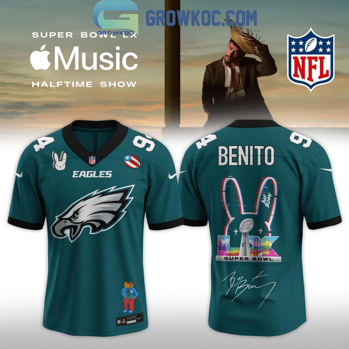 The reverse of this exclusive fan apparel prominently features Bad Bunny's unmistakable bunny logo, ingeniously framing the iconic Super Bowl LX trophy. Below, an authentic touch is added with the artist's signature, alongside 'Benito' and the distinctive '69' number, celebrating his unique and influential style that resonates with millions.
