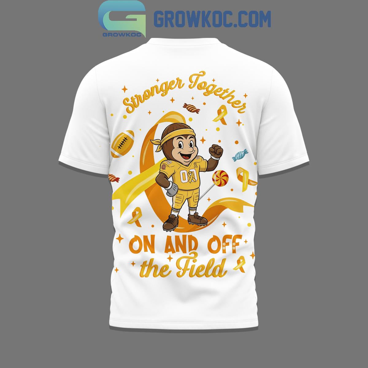 Turn the shirt around, and you will discover Brutus again, this time proudly suited in full football gear, surrounded by emblematic gold ribbons, a football, and candies. The accompanying messages, "Stronger Together" and "ON AND OFF the Field," powerfully reinforce the community spirit and collective effort essential to supporting these children. This design highlights that the fight against childhood cancer is unequivocally a team effort, mirroring the unity and determination found on the football field.
