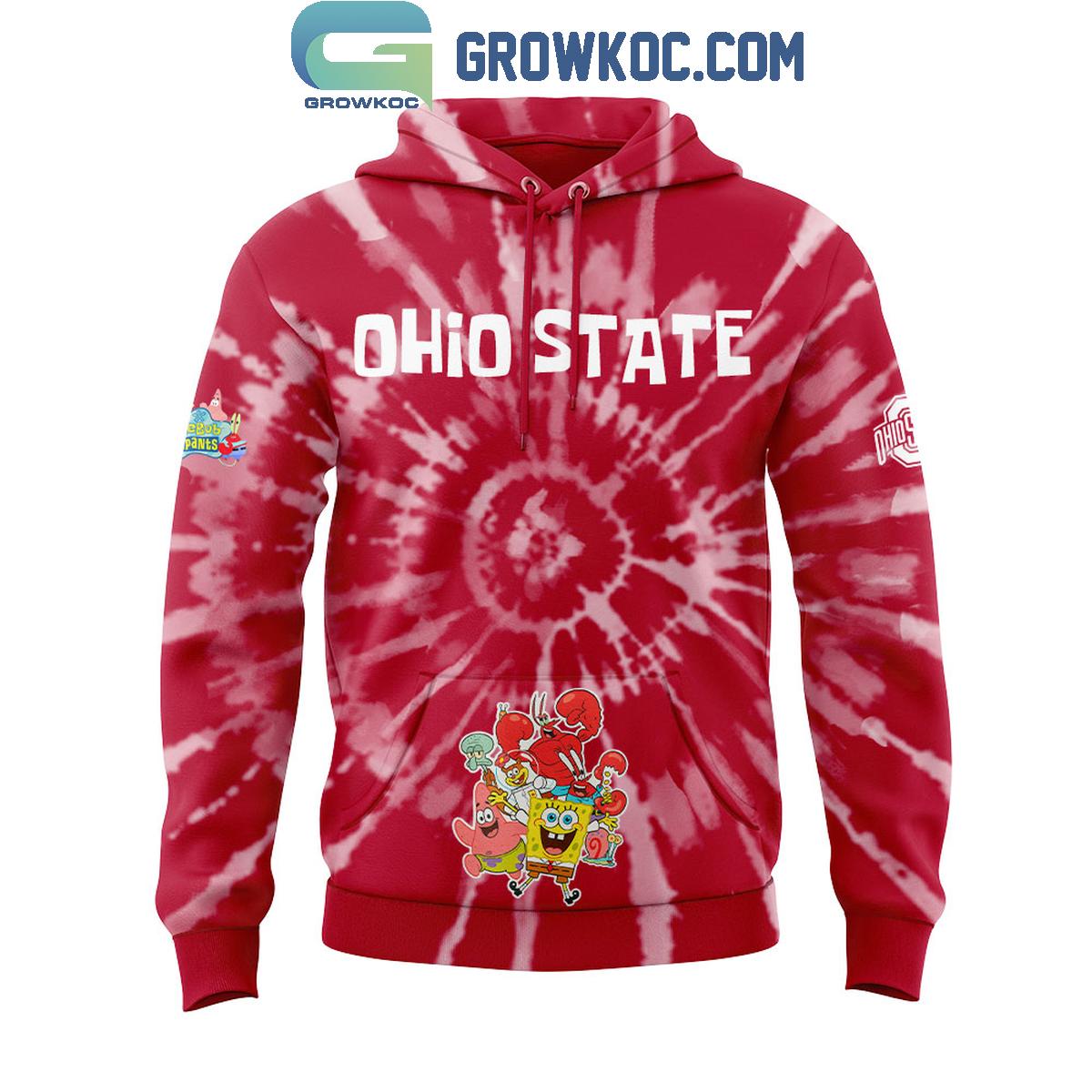 Crafted with a vibrant red and white tie-dye pattern, this hoodie immediately catches the eye, setting a dynamic backdrop for its detailed graphics. The front proudly displays "OHIO STATE" in bold white lettering, perfectly complemented by a charming depiction of SpongeBob, Patrick, Mr. Krabs, Squidward, and Gary, bringing Bikini Bottom to the Big Ten.