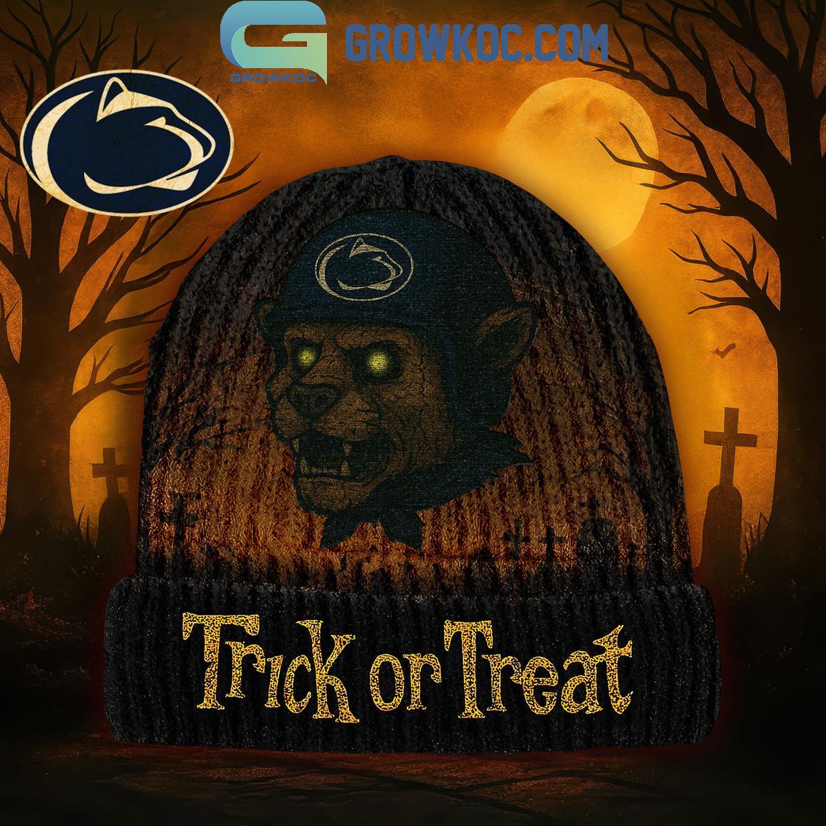 The beanie's compelling design features a fierce Nittany Lion mascot, its eyes glowing intently, proudly sporting a Penn State helmet. This iconic image is set against a haunting backdrop of shadowy trees and a full moon, creating a truly atmospheric visual. Adding a festive touch, the bold "Trick or Treat" lettering, rendered in an eye-catching golden hue on the folded cuff, perfectly encapsulates the holiday's essence and ensures you stand out in any crowd.