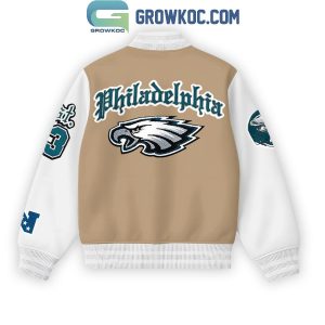 The jacket commands attention with its rich cream body, perfectly contrasted by crisp white sleeves, creating that iconic and timeless baseball silhouette. At its heart, the design proudly features bold "Philadelphia" lettering in a distinctive Old English script across the back, expertly paired with the instantly recognizable Eagles logo. The front continues this masterful blend of heritage and team pride, showcasing a large, stylized Old English initial design and another prominent Eagles emblem positioned thoughtfully near the pocket, affirming your allegiance from every angle.