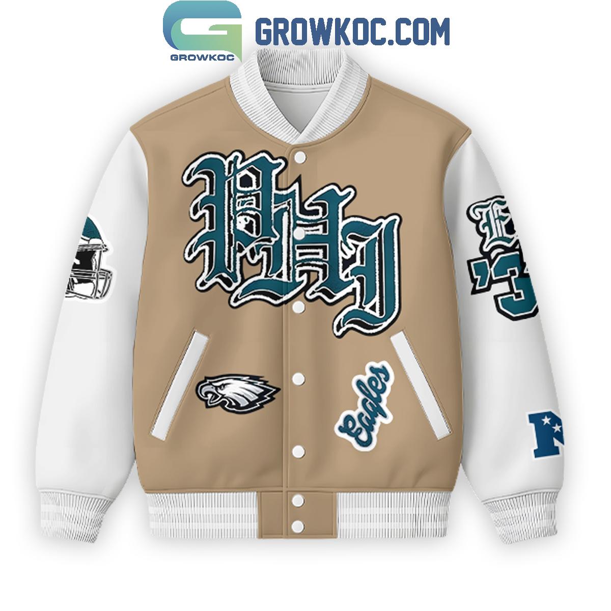 The jacket commands attention with its rich cream body, perfectly contrasted by crisp white sleeves, creating that iconic and timeless baseball silhouette. At its heart, the design proudly features bold "Philadelphia" lettering in a distinctive Old English script across the back, expertly paired with the instantly recognizable Eagles logo. The front continues this masterful blend of heritage and team pride, showcasing a large, stylized Old English initial design and another prominent Eagles emblem positioned thoughtfully near the pocket, affirming your allegiance from every angle.