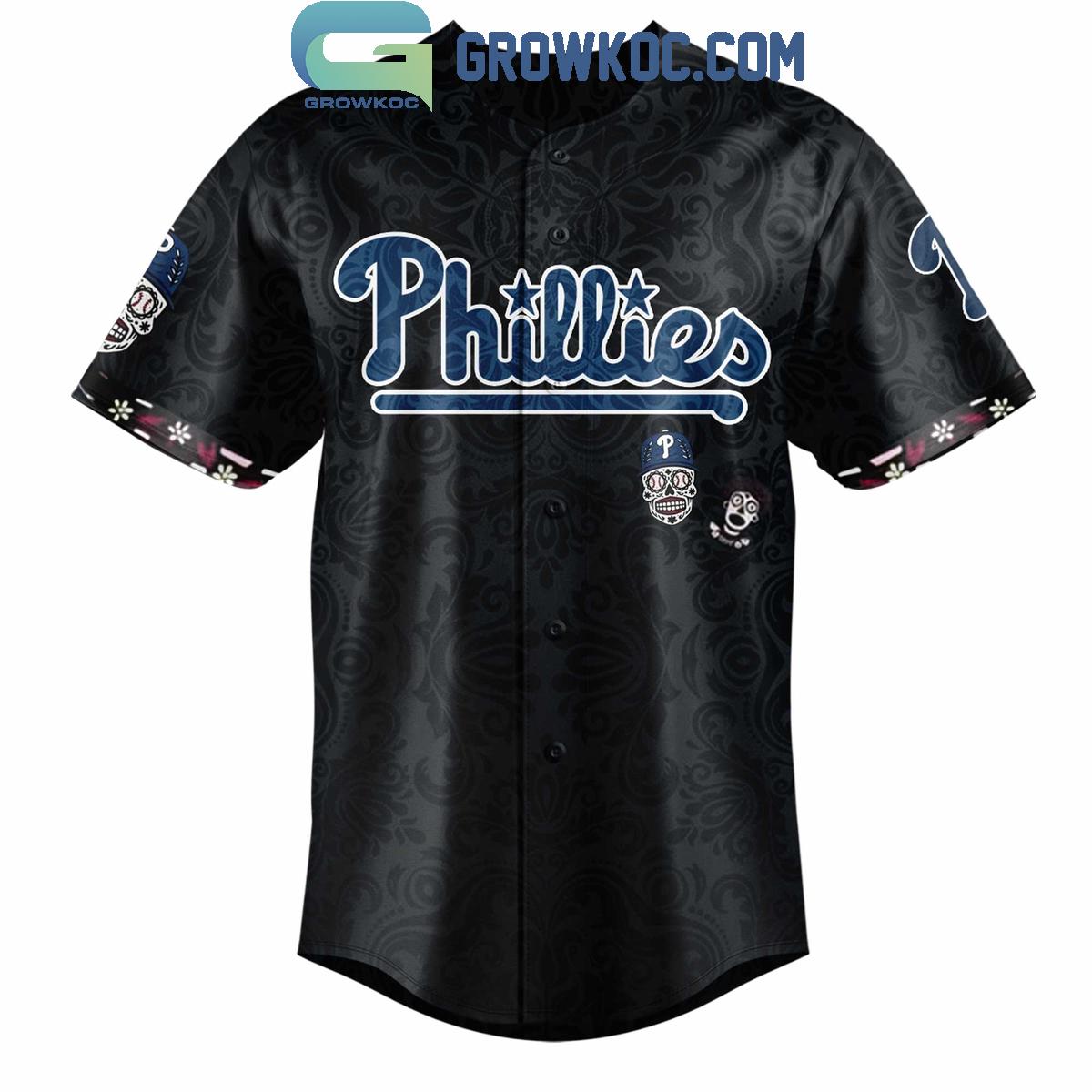 Crafted in a sleek black, the jersey features a subtle yet intricate dark paisley pattern woven throughout the fabric, adding a sophisticated depth to its aesthetic. The iconic 'Phillies' script logo, rendered in classic blue and white, proudly adorns the chest, complemented by a full button-down front. Look closer to discover a charming sugar skull motif, complete with a Phillies 'P' cap, subtly integrated onto both the lower front and sleeves – a tasteful nod to the rich cultural inspiration.