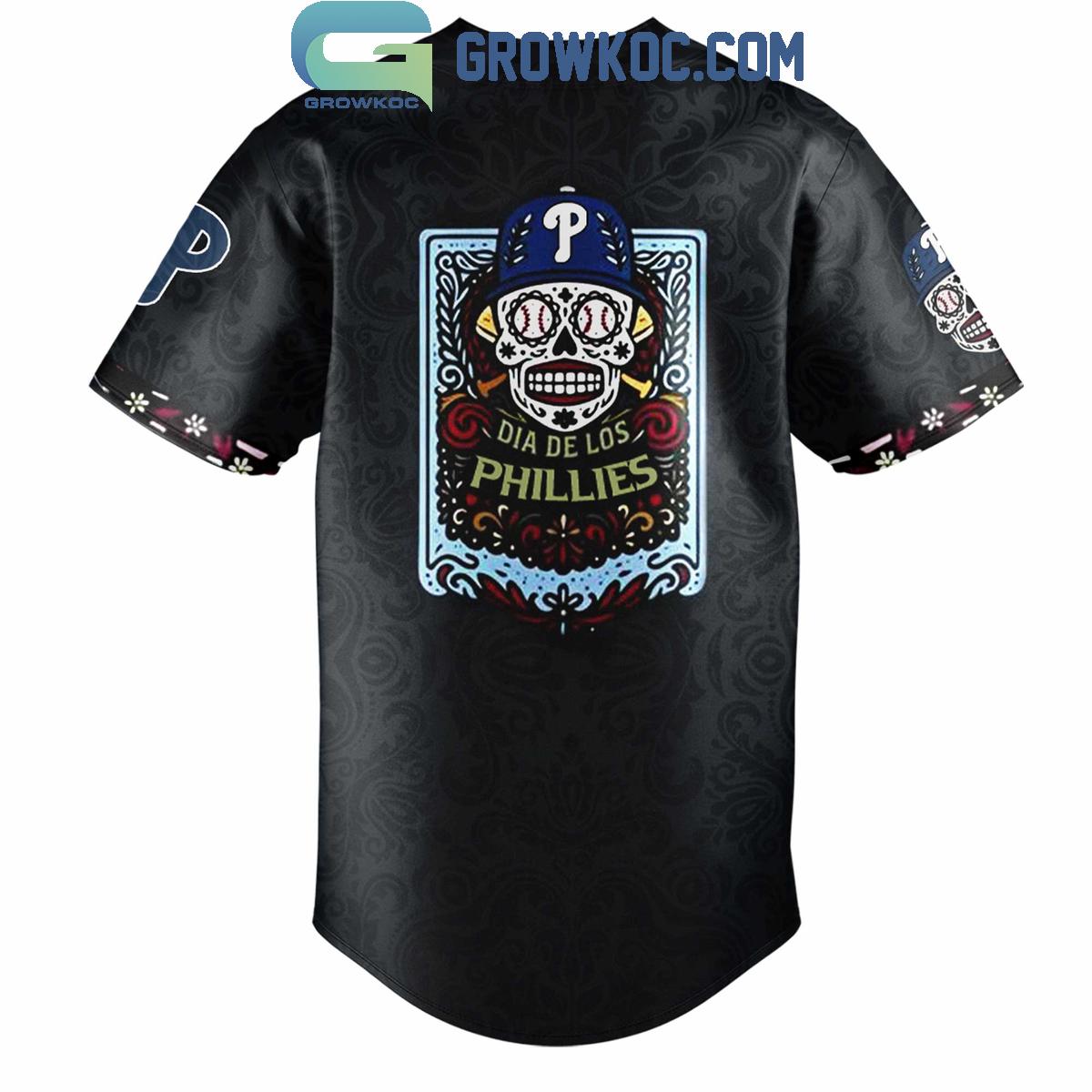 The reverse side unveils a truly stunning, large-scale graphic that serves as the centerpiece of this design. Here, a meticulously detailed sugar skull takes prominence, sporting a Phillies 'P' hat, its eyes cleverly fashioned from baseballs, and flanked by crossed bats. Boldly emblazoned with 'DIA DE LOS PHILLIES,' this intricate artwork perfectly encapsulates the festive spirit of Dia de los Muertos, transforming this jersey into a wearable celebration of heritage and sport.