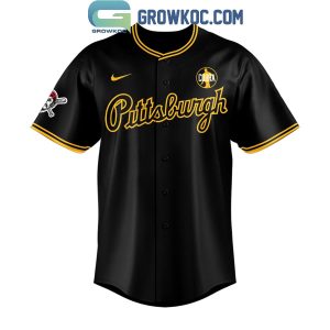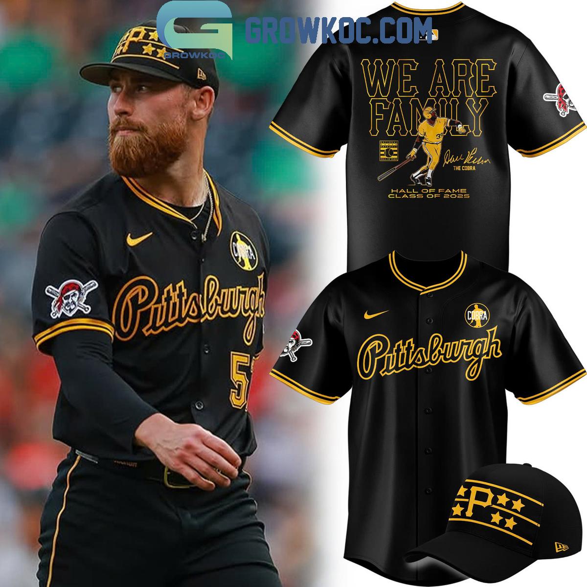 Crafted in a sleek black base with bold yellow trim, the jersey features the classic Pittsburgh script across the chest, accompanied by special patches such as the Cobra emblem and Pirates skull & crossbones on the sleeves. On the back, the design proudly displays Parker’s silhouette with the phrase “We Are Family”, a nod to the legendary 1979 World Series team, along with his signature and “Hall of Fame Class of 2025” in golden lettering.