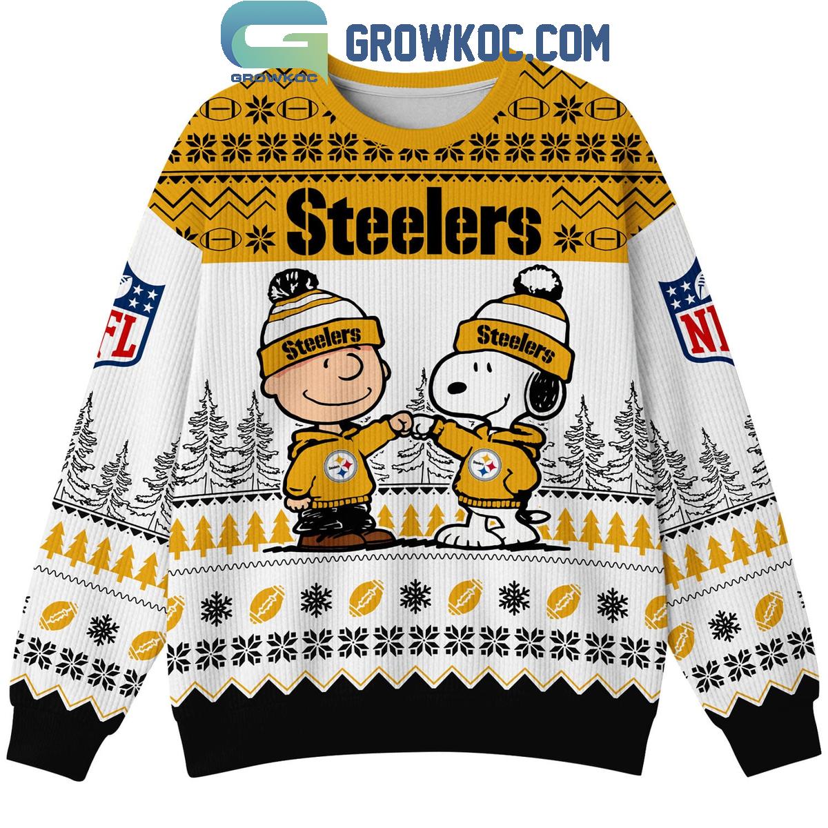 This ugly Christmas sweater is styled with classic winter patterns, including snowflakes, football icons, and evergreen trees, seamlessly woven into the unmistakable black, gold, and white Steelers color scheme. The front artwork highlights Snoopy and Charlie Brown sharing a celebratory fist bump in Steelers outfits, symbolizing unity, loyalty, and team spirit. On the back, Snoopy and Woodstock add energetic movement and fun, making the sweater visually engaging from every angle. NFL-inspired sleeve patches and bold lettering give it an authentic, game-day-ready look.