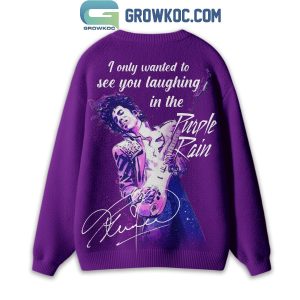 The front of the cardigan features the iconic "Prince" script logo along with the unforgettable symbol, instantly recognizable to fans. Turning to the back, you'll find a striking image inspired by the "Purple Rain" era, capturing Prince in his element, guitar in hand. The lyrics "I only wanted to see you laughing in the Purple Rain" are printed above the image.