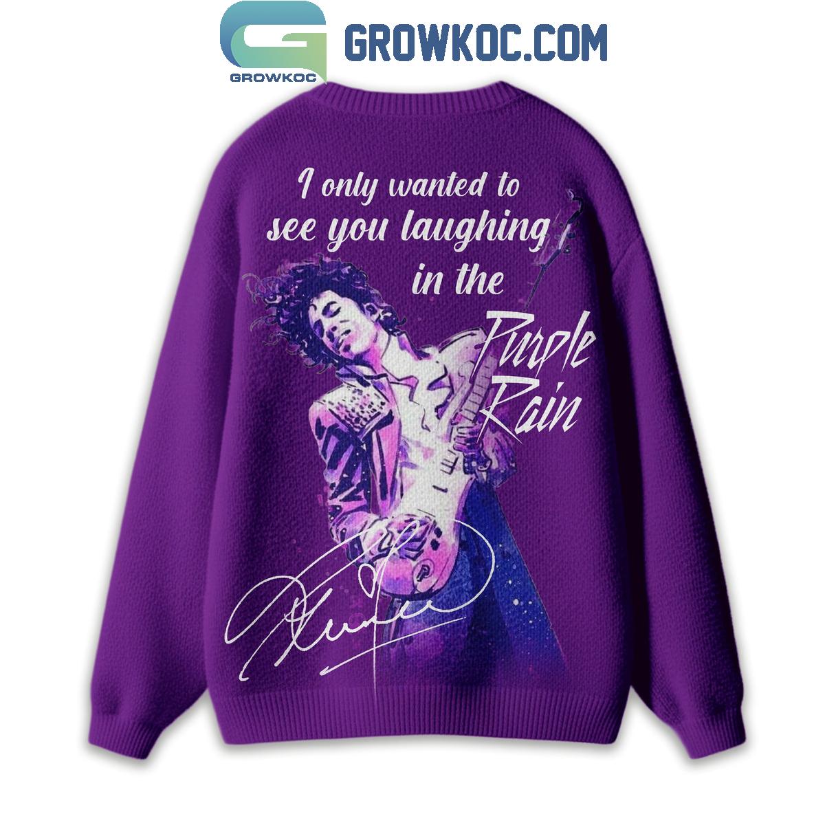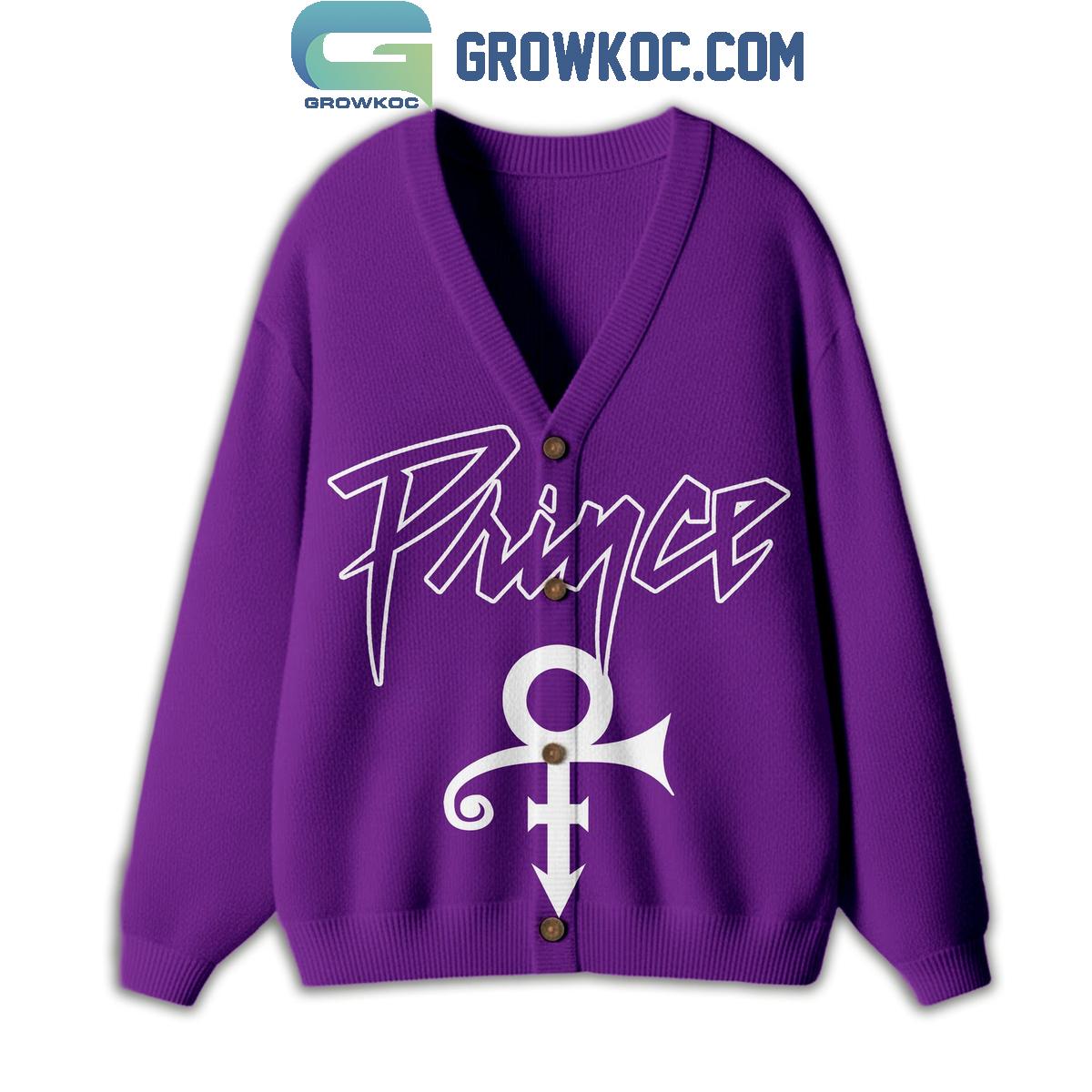 The front of the cardigan features the iconic "Prince" script logo along with the unforgettable symbol, instantly recognizable to fans. Turning to the back, you'll find a striking image inspired by the "Purple Rain" era, capturing Prince in his element, guitar in hand. The lyrics "I only wanted to see you laughing in the Purple Rain" are printed above the image.