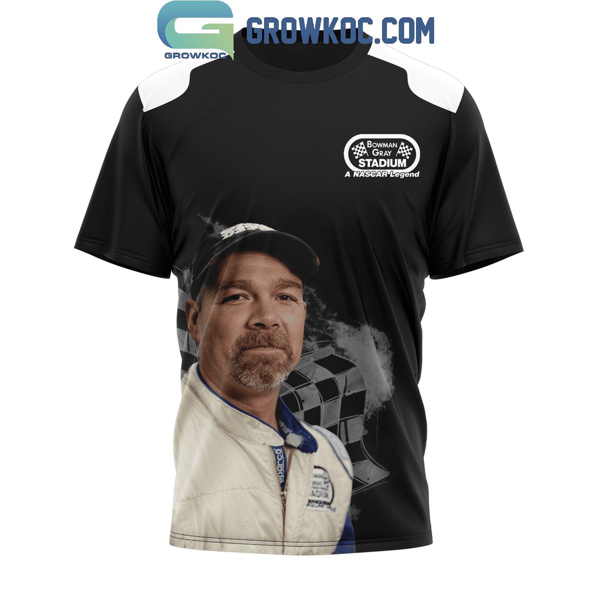 On the front, the shirt features a striking portrait of Robbie Brewer in his racing gear, alongside the Bowman Gray Stadium – A NASCAR Legend emblem, symbolizing his strong connection to one of the sport’s most iconic venues. Subtle checkered flag graphics in the background add a touch of racing heritage to the design.