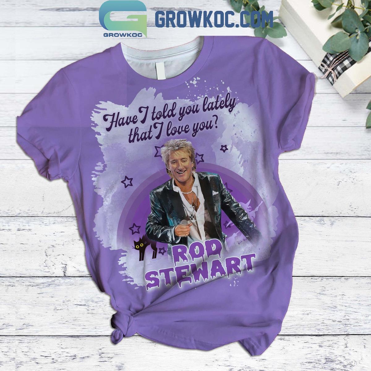 The short-sleeved top, rendered in a striking purple hue, features a prominent graphic of Rod Stewart himself, microphone in hand, exuding his signature energy. Above him, the iconic lyric "Have I told you lately that I love you?" is beautifully displayed, instantly evoking the romantic ballad. Subtle stars and playful black cat silhouettes add to the whimsical rock-and-roll aesthetic, making this more than just sleepwear – it's a piece of fan art.