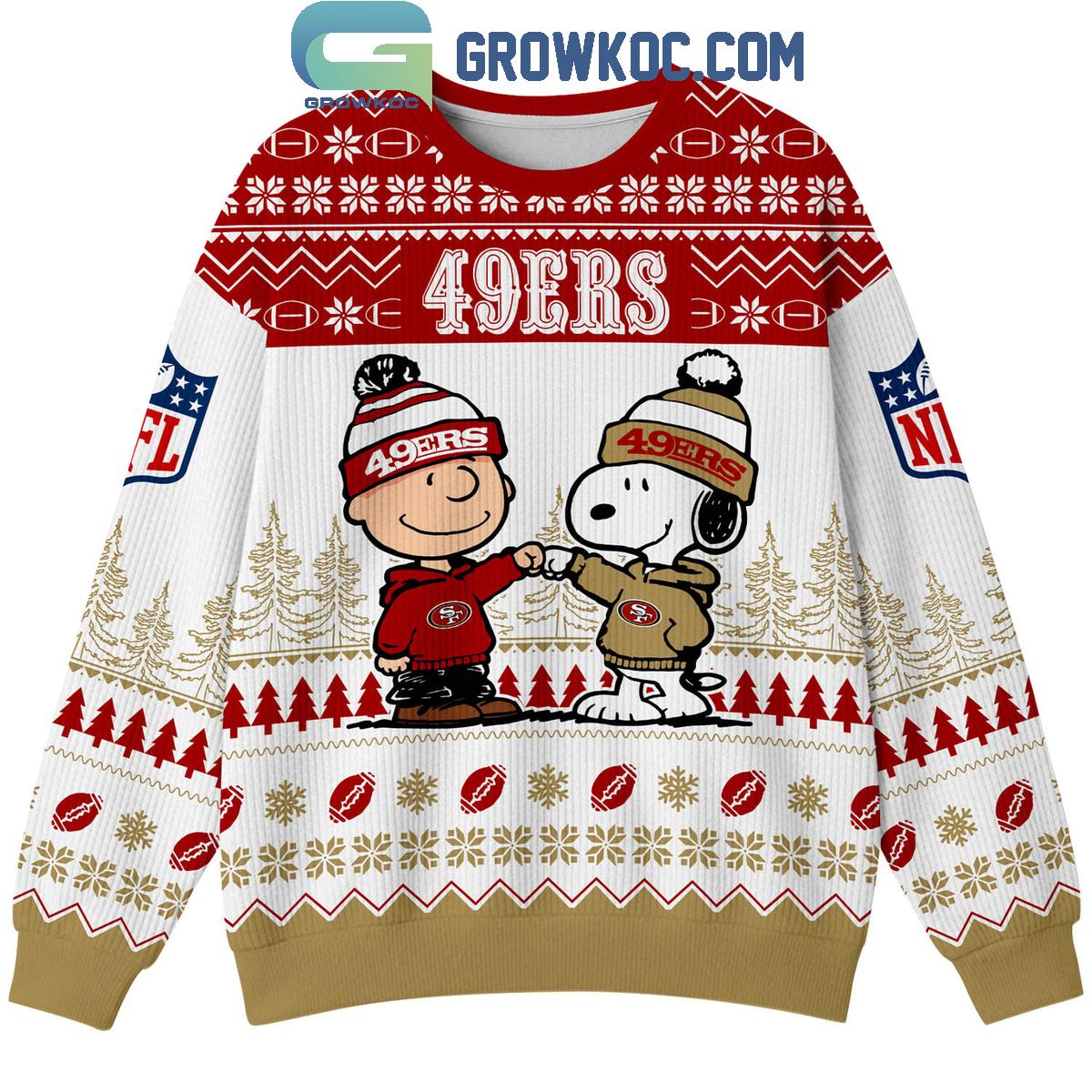Crafted with a bold all-over knit print, the sweater showcases traditional holiday patterns such as snowflakes, football motifs, and winter trees blended seamlessly with the San Francisco 49ers’ signature red, gold, and white color palette. The front artwork highlights Snoopy and Charlie Brown sharing a celebratory fist bump in 49ers outfits, symbolizing teamwork and unity, while the back design brings playful energy with Snoopy and Woodstock in action. NFL-inspired sleeve details and strong typography give the sweater an authentic, game-day-ready feel.