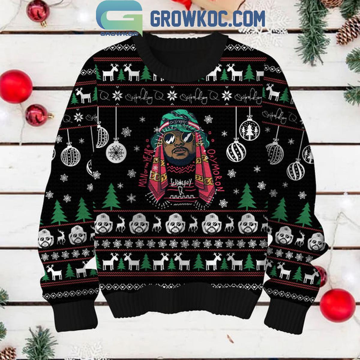 On the back, you’ll find a mix of playful holiday icons, including more snowflakes, Christmas trees, and even the American flag for an extra touch of patriotism. The overall design combines the traditional elements of an ugly Christmas sweater with the modern twist of ScHoolboy Q’s music and aesthetic, making it the perfect choice for music lovers and fans of unique holiday sweaters.