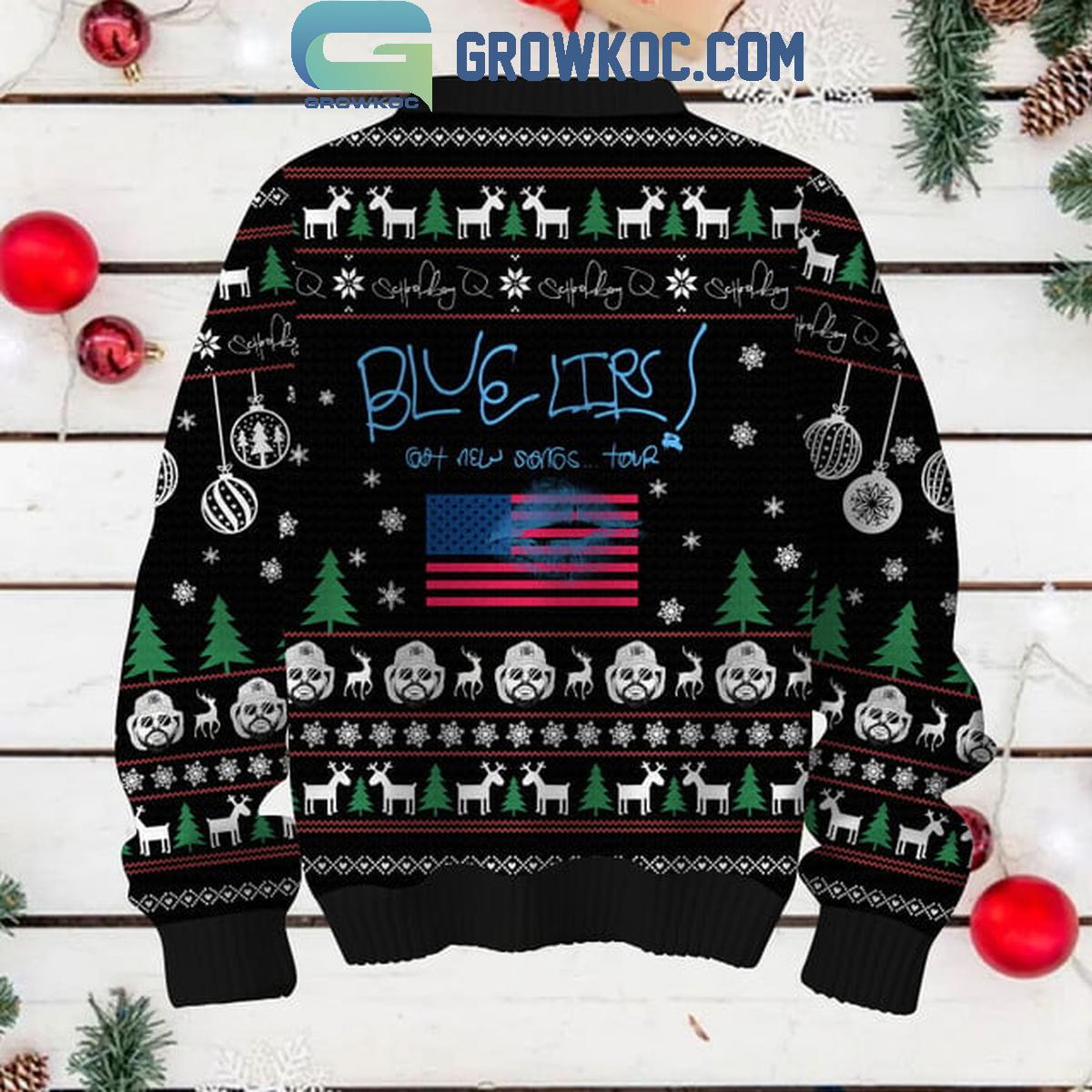 The sweater features a bold, eye-catching design, with ScHoolboy Q himself taking center stage. The front showcases a vibrant illustration of the artist wearing a colorful scarf and sunglasses, surrounded by playful elements like snowflakes, Christmas trees, and reindeer, creating a fun and festive atmosphere. The phrase **Blue Lips!** is featured prominently, referencing the artist’s iconic style and music, along with Got New Songs Tour for an added touch of ScHoolboy Q’s tour life.