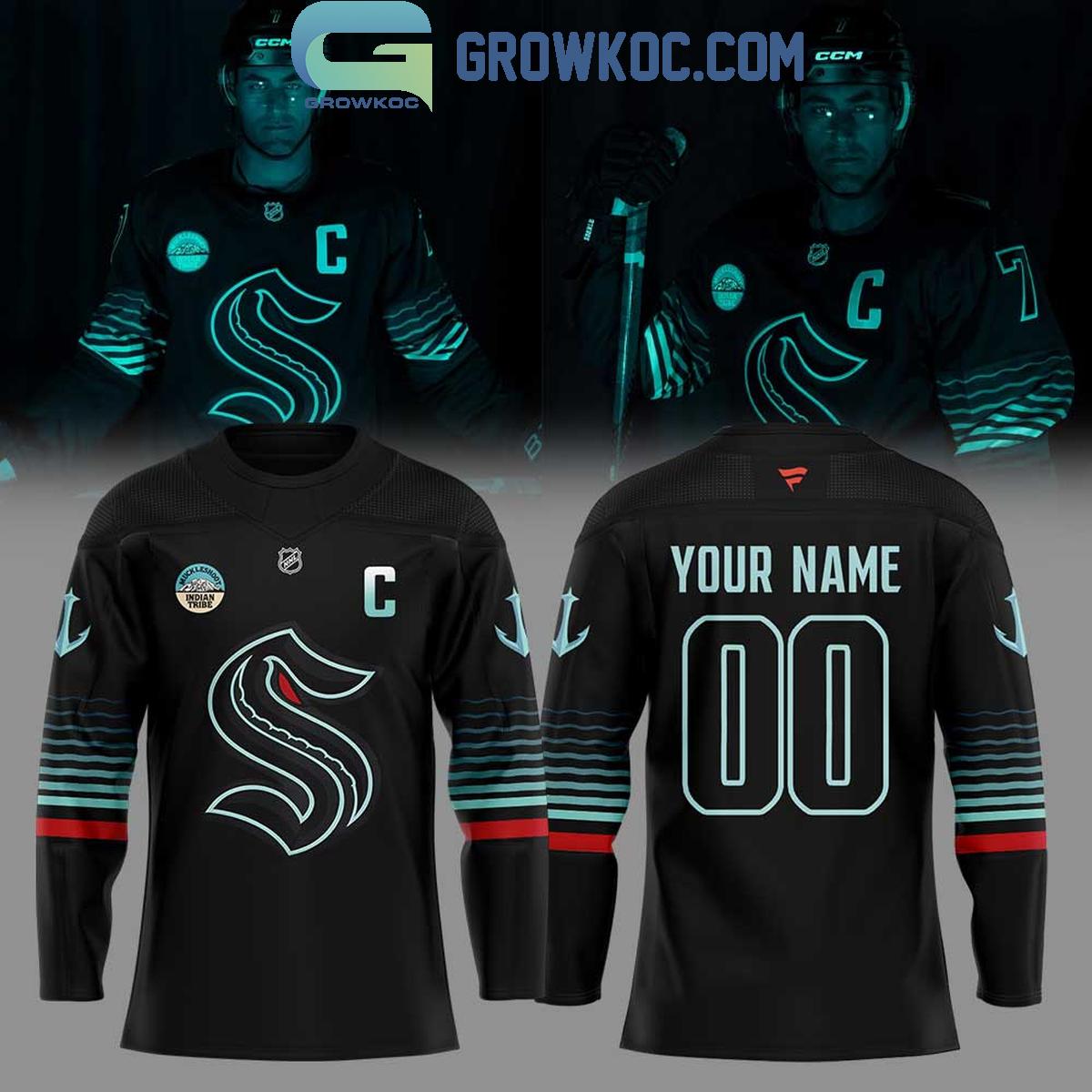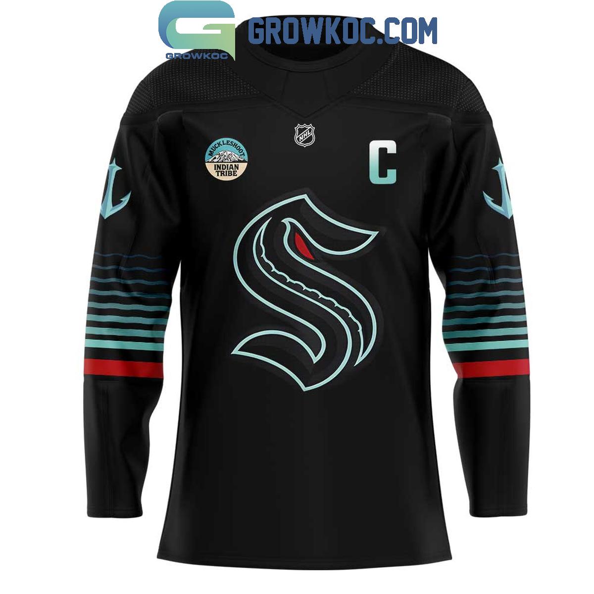 Every detail on this sleek black-based jersey has been meticulously crafted to capture the Kraken's formidable presence. The front proudly showcases the team's instantly recognizable "S" logo, outlined in that signature glowing teal, with a striking red eye detail. For those who appreciate authentic team representation, the captain's "C" patch is prominently displayed, alongside the official NHL shield, signifying its place within the league's elite. Additionally, the vital Muckleshoot Indian Tribe partnership patch on the left shoulder underscores the team's deep community roots and commitment.
