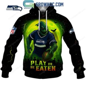 Unleash an unparalleled fusion of seasonal festivity and unwavering team spirit with the Seattle Seahawks Play Or Be Eaten Halloween Hoodie T-Shirt. This distinctive apparel masterfully unites the fervent energy of NFL fandom with the thrilling essence of Halloween, making it an essential piece for any devoted Seahawks supporter seeking to make a bold statement.