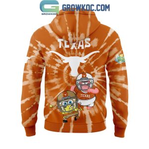 The immediate visual impact comes from its eye-catching orange and white tie-dye pattern, a dynamic backdrop that sets the tone for this spirited design. Boldly emblazoned across the chest, the word "TEXAS" proudly declares your allegiance. The front pouch pocket serves as a lively canvas, featuring a spirited graphic of SpongeBob, Patrick, and friends, adding an undeniable touch of playful irreverence to this otherwise classic collegiate silhouette.