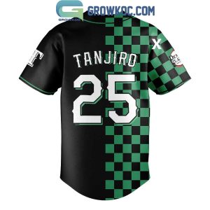 Turning to the back, the jersey spotlights "TANJIRO" above the prominent number "25", mirroring the personalized detail of a professional player's uniform. This thoughtful inclusion allows fans to wear their admiration for the determined demon slayer with pride, celebrating his journey and strength. The presence of both the official *Demon Slayer* and Texas Rangers logos further solidifies its authentic blend of anime and sports culture.
