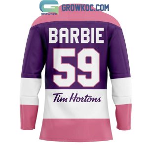 The front proudly features the official PWHL crest, rendered in white, showcasing the league's distinctive stylized crossed hockey sticks logo. Adjacent to the collar, a subtle "Tims" maple leaf patch signifies Tim Hortons' integral role in this exciting venture. Turning to the back, the jersey prominently displays "BARBIE" in large white lettering above the number "59," with the "Tim Hortons" wordmark positioned just below, celebrating the playful and empowering essence of the collaboration.