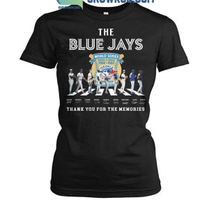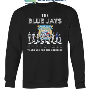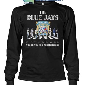 The shirt features a striking graphic of past Blue Jays superstars lined up around the World Series logo, with their names and facsimile signatures printed below. The bold “Thank You for the Memories” message reminds fans of the pride and joy these champions brought to Toronto and to baseball history.