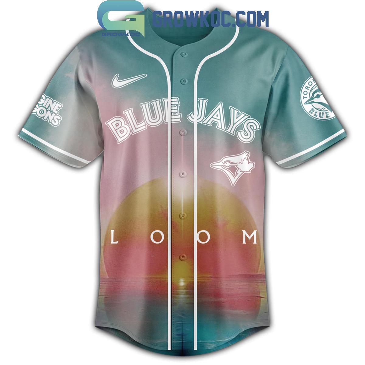 The front of the jersey features the classic Blue Jays script and logo in crisp white against a dreamy teal-to-sunset gradient inspired by the Loom album aesthetic. A Nike-style swoosh on the chest and “LOOM” printed across the lower front give this piece its unique musical edge. The Blue Jays shoulder patch adds authenticity to this custom collaboration.