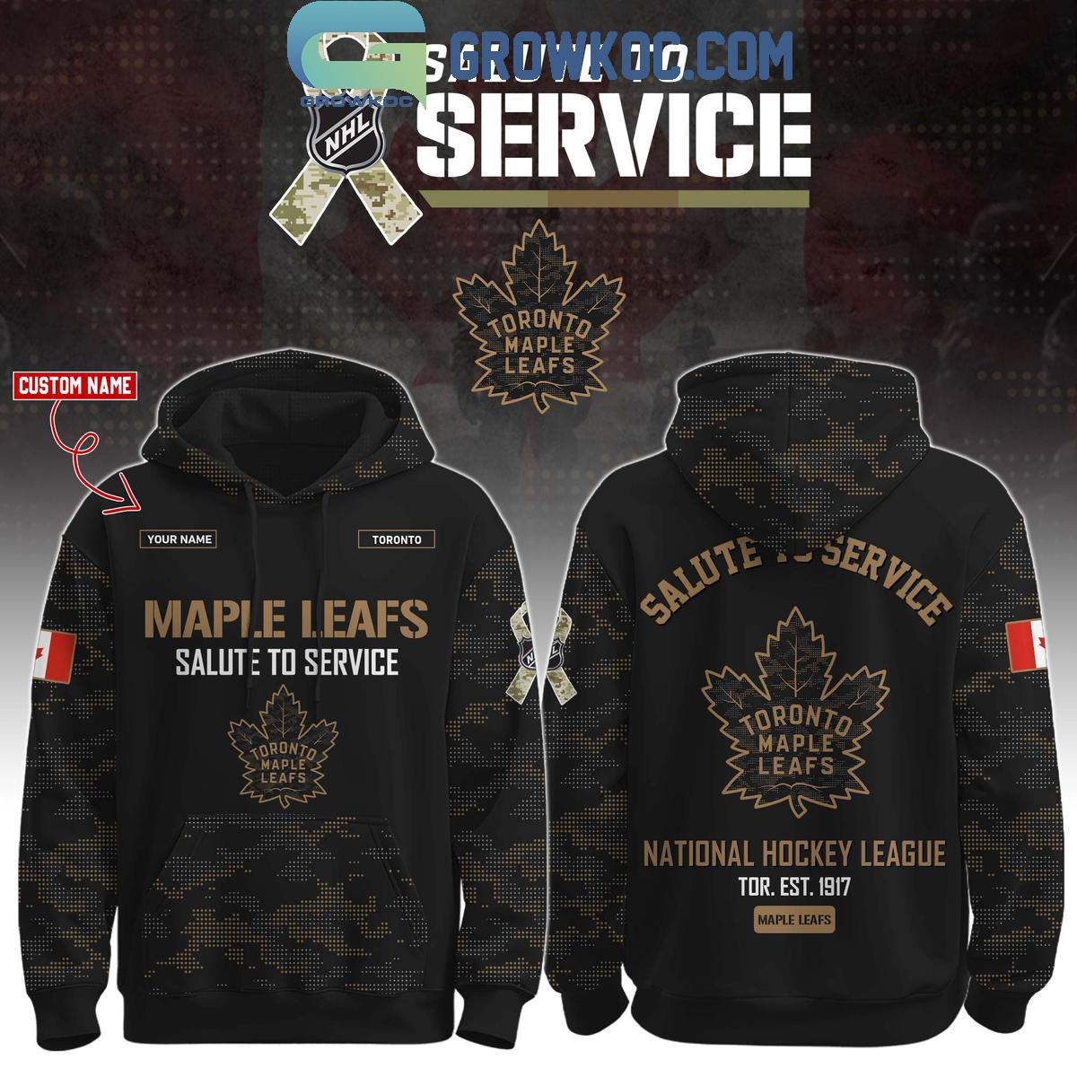 The reverse side of the hoodie reinforces its powerful message with "SALUTE TO SERVICE" elegantly arched above the team's revered emblem. Below, "NATIONAL HOCKEY LEAGUE TOR. EST. 1917" proudly highlights the Toronto Maple Leafs' storied legacy and enduring presence in professional hockey. Every detail underscores the team's deep roots and its commitment to community values.