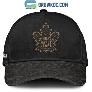 Crafted with attention to detail, the hoodie features a striking black and gold digital camouflage pattern that forms a distinctive backdrop for the iconic Toronto Maple Leafs logo. The front proudly displays the bold declaration "MAPLE LEAFS SALUTE TO SERVICE," accompanied by an authentic Canadian flag patch and a symbolic service ribbon graphic. These elements are thoughtfully integrated to convey deep respect and appreciation for those who serve.