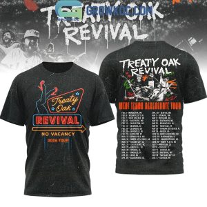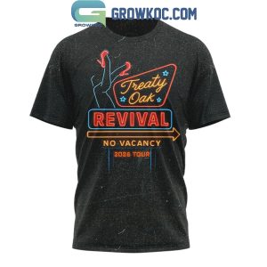 The shirt boasts striking graphics on both the front and back. The front features a captivating neon sign-inspired design prominently displaying the band's name, instantly recognizable to fellow fans. Turning to the back, you'll find a comprehensive listing of all the tour stops from the West Texas Degenerate Tour, transforming the garment into a wearable piece of music history and a conversation starter. The overall design perfectly captures the raw, energetic spirit that defines Treaty Oak Revival's distinctive sound.