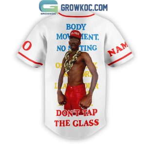 The front of the jersey features a clean white base with bright red piping and accents, staying true to the classic baseball jersey silhouette. Front and center is a shattered-glass visual effect, behind which stands Tyler’s unmistakable face with “GLASS” printed boldly across his hat. The warning text “DON’T TAP THE GLASS” drives home the humor, unpredictability, and boundary-pushing attitude Tyler is known for.