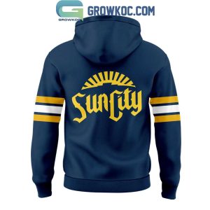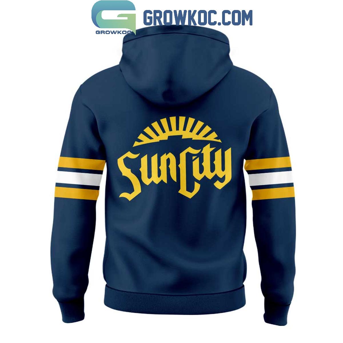 Turn around, and the hoodie reveals its unique "Sun City" tribute. A striking gold "Sun City" graphic, complete with a radiant sunburst design, dominates the back, celebrating El Paso’s vibrant nickname. The sleeves further enhance the uniform-inspired look with crisp gold and white stripes, mirroring the classic athletic stripe patterns seen on the field.