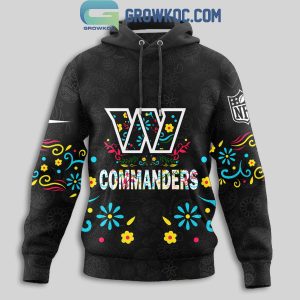 The front of this premium hooded shirt presents a striking visual narrative. Against a deep black base, the bold white Washington Commanders 'W' logo and team name are artfully integrated amidst an intricate tapestry of bright floral patterns and subtle sugar skull designs. This delicate balance of team identity and cultural motifs creates a visually engaging composition. Authenticity is further guaranteed by the official NFL shield prominently displayed on the sleeve, confirming its genuine connection to the league.