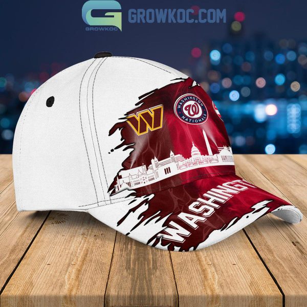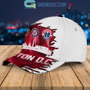 The Washington Commanders, Nationals, and Wizards Skyline Cap is the ultimate hat for any proud D.C. sports fan. This stylish and customizable cap features a bold Washington, D.C. city skyline design, paired with the official logos of the Commanders (NFL), Nationals (MLB), and Wizards (NBA). Its vibrant red-and-white color scheme with dynamic brushstroke graphics gives it a modern, eye-catching look that stands out whether you’re at the stadium or on the streets.