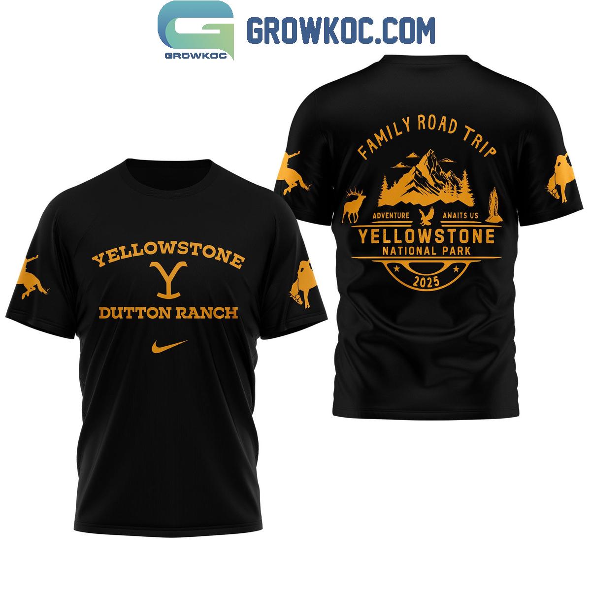 Embark on your next journey with the "Yellowstone Dutton Ranch Family Road Trip Shirt," a meticulously designed garment that pays homage to the iconic Western saga and the compelling allure of the open road. This striking black tee proudly showcases the revered "Yellowstone Y Dutton Ranch" emblem on its front, rendered in bold, vibrant gold lettering. A subtle yet instantly recognizable swoosh detail beneath the emblem firmly connects you to the enduring legacy of the Dutton family, signifying an authentic piece for any devoted fan.