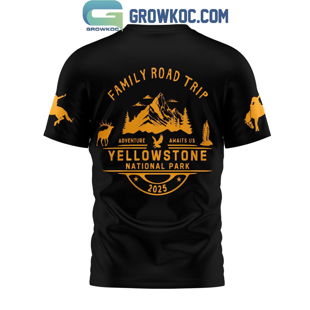 The shirt's true narrative unfolds on its back, featuring a captivating graphic that declares "Family Road Trip" alongside the inspiring message, "Adventure Awaits Us Yellowstone National Park 2025." This detailed artwork masterfully captures the rugged essence of Montana's wilderness, depicting majestic mountains, towering pines, and evocative silhouettes of native wildlife, including a graceful deer and a soaring eagle. It serves as an ideal memento for commemorating a planned future expedition or simply as a profound celebration of your deep-seated love for the untamed beauty of national parks and the spirit of exploration.
